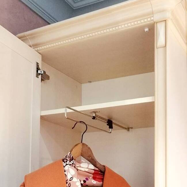 Шкаф однодверный для прихожей оборудован верхней полкой и выдвижной штангой для одежды. Кремовый цвет фасада оттеняет легкая патина.
