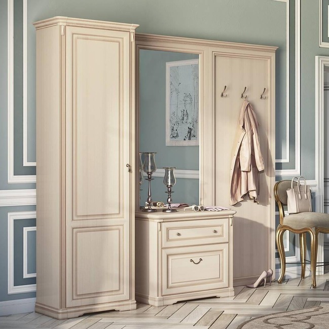 Высота 224 смШирина 71,8 смГлубина 46,8 смПредметы в модульном наборе ШкафМатериал фасада МДФМатериал каркаса МДФМатериал полок ЛДСПМатериал вешалок МеталлМесто размещения Спальня, Детская, ПрихожаяАнтиквариат НетПрименение техники старения НетСтиль КлассическийЦвет фасада БежевыйЦвет каркаса БежевыйРучки ДаШпингалеты НетЗамки НетКрючки НетВешало НетДоводчик ДаУгловая НетЗеркало НетСтрана РоссияПроизводитель Миассмебель