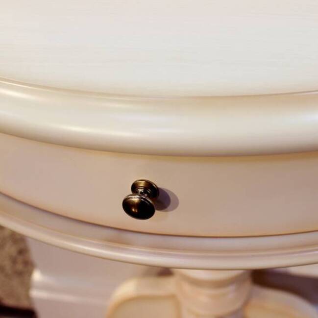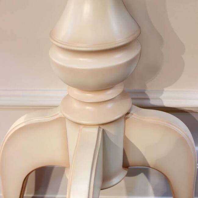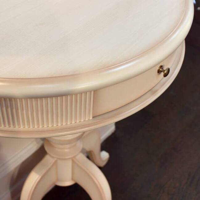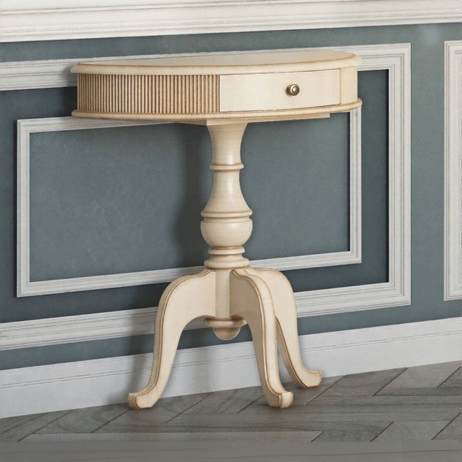 Небольшой консольный столик, выполненный в кремовом цвете, на изящной ножке будет прекрасно смотреться в небольшой прихожей. Столешница изделия украшена резным элементом с отделкой патиной.