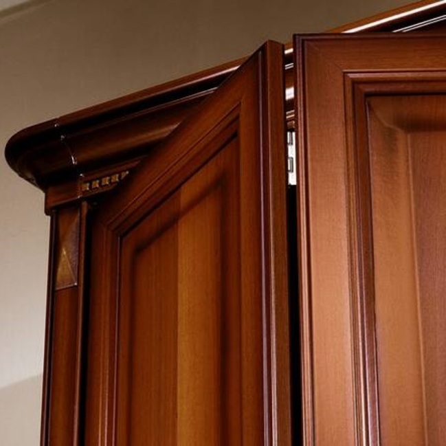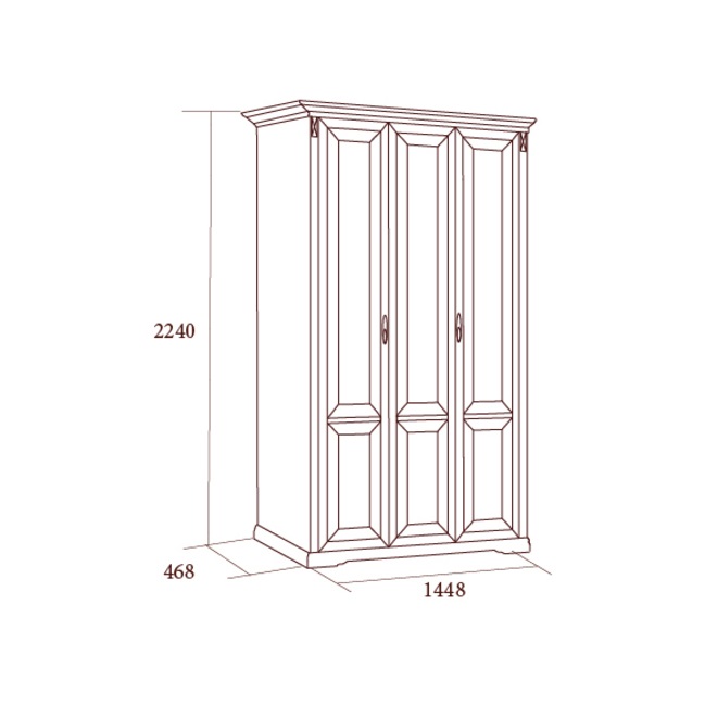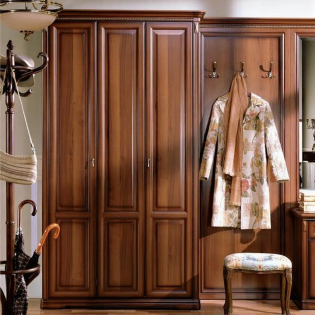 Шкаф 3-дверный для прихожей оборудован полкой для хранения головных уборов. Для верхней одежды установлены две выдвижные штанги. Фасад шкафа декорирован резными накладными элементами с отделкой патиной.