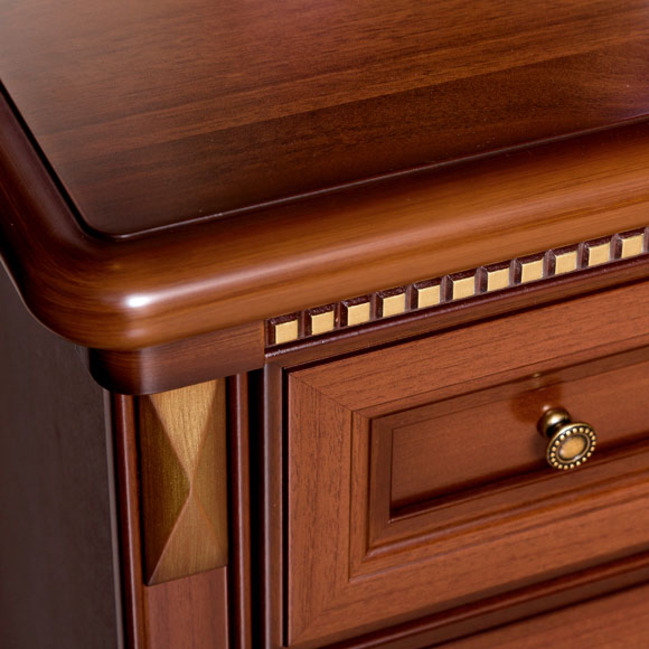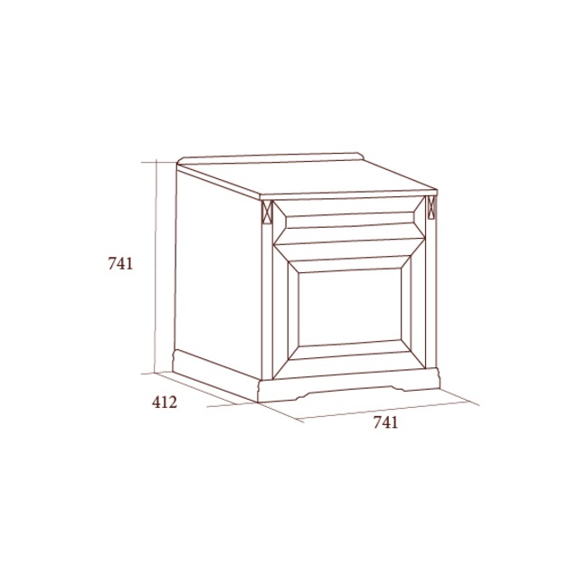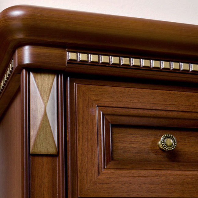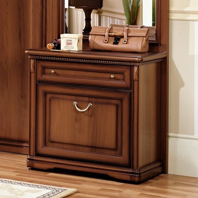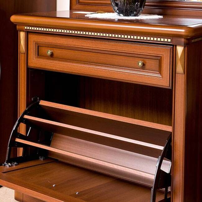 Небольшая компактная тумба с легкостью сможет разместиться даже в небольшой прихожей комнате. За откидной дверцей в тумбе находятся два отделения для хранения обуви. В верхней части расположен выдвижной ящичек для хранения ключей и предметов по уходу за обувью. Накладные резные элементы и фурнитура цвета античной бронзы в сочетании с патиной подчеркивают классический стиль мебели.