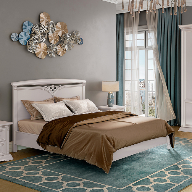 Центральную часть кровати украшает ключевой элемент, а небольшие декоративные элементы на вертикальных брусках-колоннах дополняют и делают узнаваемым облик всего набора. Головная спинка декорирована шпоном. Любую головную спинку кровати, по желанию, можно доукомплектовать мягким элементом.