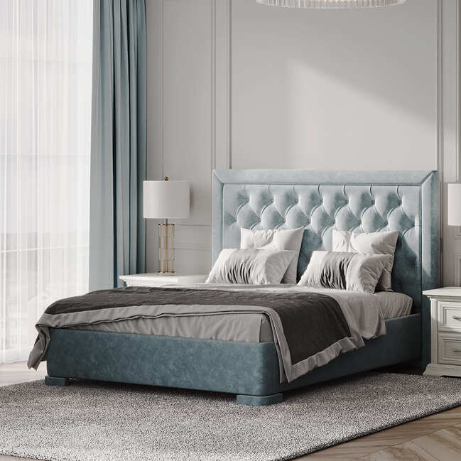 Кровать драпирована тканью, выполнена в цветовом решении Seven 107(голубая). Seven велюр визуально и тактильно напоминает благородный кашемир, а необычная фактура создает мерцание и игру цвета на поверхности.