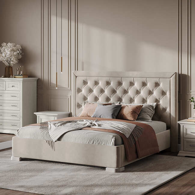 Кровать драпирована тканью, выполнена в цветовом решении Dream 02 (бежевая). Dream микровелюр визуально и тактильно напоминает благородный кашемир, а необычная фактура создает мерцание и игру цвета на поверхности. Мягкая и нежная на ощупь, благодаря оригинальной структуре верхнего слоя, ткань не имеет пальчикового эффекта.