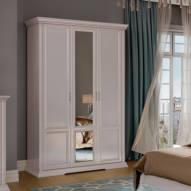 Шкаф 3-х дв. в коллекции Lorenzo пудра с центральным зеркалом. Широкий фацет зеркала - едва уловимая деталь, придающая изделию необычный блеск и завершенный вид. В изделии используется шпон и массив ясеня. Функциональное наполнение шкафов позволит Вам с удобством и комфортом разместить необходимые вещи: в центральной части предусмотрена полка со штангой для хранения длинных вещей и одна полка нижнего расположения, в боковой части слева предусмотрено наполнение полками..