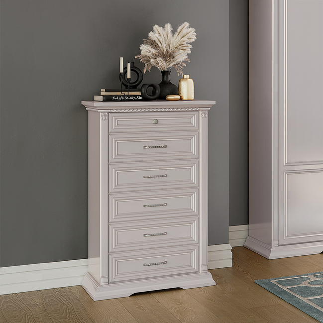 Комод К-6 выполнен в цвете пудра. Фасад изделия декорирован декоративными накладными элементами. Высококачественная фурнитура обеспечивает долгий срок эксплуатации изделия. Комод оборудован шестью выдвижными ящиками для хранения необходимых в спальне вещей.