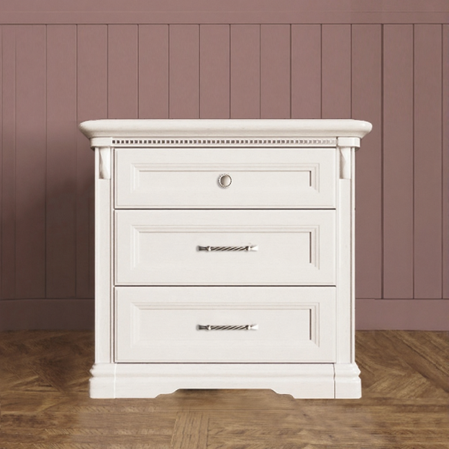 Тумба прикроватная имеет три выдвижных ящика. Ящики оборудованы системой доводки. Фасад тумбы декорирован резными накладными элементами. Надежность изделия обеспечивается высококачественными комплектующими и фурнитурой европейских производителей.