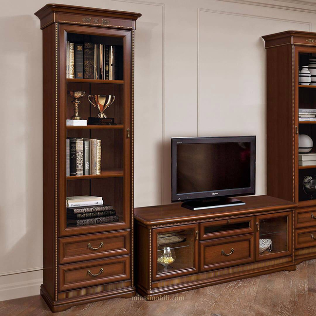 Однодверная витрина выполнена в цвете орех, отделка легкой патиной. Фасад витрины декорирован накладными элементами. Высококачественная фурнитура обеспечивает долгий срок службы.