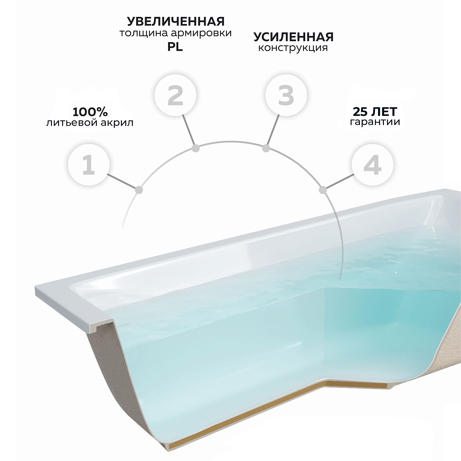Акриловая ванна TONI ARTI серии PL в 3 раза толще обычных ванн — толщина в 10 мм гарантирует, что ваша ванна остаётся жёсткой, прочной и бесшумной. А акрил премиум-класса ваша гарантия безупречного комфорта на десятилетия!